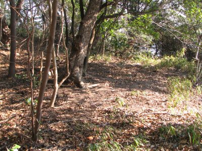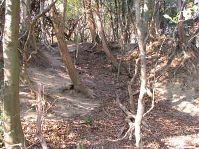 尾根を東に進むと、MとNの間の辺りに円形窪地がある。こちらも用途不明。その東に北に向いて掘られた溝Oがある。これも良くわからない。