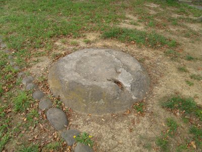左:南東から、奥の山が高塔山、右:唯一残っている高射砲の基礎