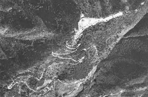 小倉の南東にそびえ立つ足立山から、南西西に伸びる尾根の先に砲台山(442m)があり、この山頂付近が高射砲陣地跡である。