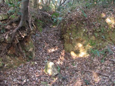 更に西側は平坦地Cがある。南西側に円形土塁の残骸らしきものがある。初めは砲座を埋め立てた跡かとも思ったが、航空写真では砲座は写っていないので何なのかは不明である。またCの南下には東側に出入口のある方形窪地がある。待避所だろうか。
