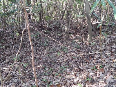 岩熊山山頂の南東300mにあるピーク(謎施設2)の南西に伸びる尾根筋に、機銃陣地らしい施設跡がある。