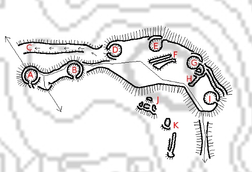 南東側の2基の砲座らしきものの内、東側の窪地Aは砲座跡と言えばそれっぽい雰囲気はあり、また広さは十分にあるものの、羊歯が一面に茂っているために地形を完全に把握できない。またその対となる位置には平坦地Cがあるが、こちらは普通に平坦面で外縁の土塁らしき痕跡が無い。北側の縁に直線に列石が並んでいるので人工的地形であることは確かなようだが、さすがに砲座とは呼べない。