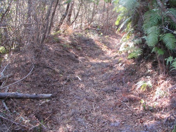 一応三角点まで登ってみた。藪に埋もれているものの途中の尾根まで道が立派な道が続いている。しかしその先は酷い藪。特に山頂付近は深い羊歯で覆われており、移動も地形の把握も困難だった。余りの疲労にもう2ヵ所の砲座の確認をする気にもなれずに撤退する。