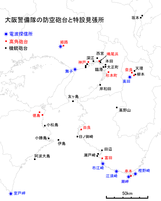 | 鳴尾浜 | 12cm(4) | 25mm(3) | 甲子園付近と阪神武庫川線須崎駅 川西飛行機の工場防衛? |