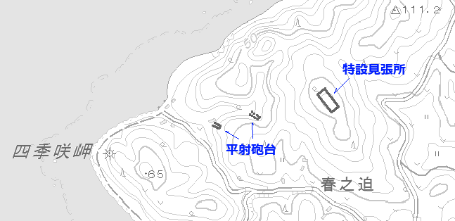 「熊本の戦争遺跡」(創想舎)によると、西端の四季咲岬の北東500m程にある、標高約100mの山頂に見張所があり、現在も建物基礎やトイレ・水槽の跡が残っているらしい。