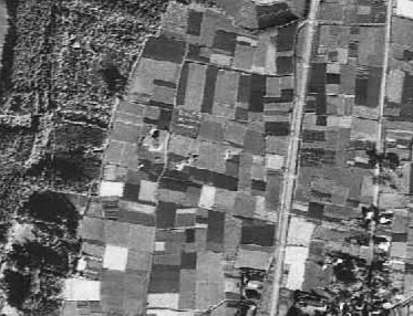厚木基地の東側、小田急江ノ島線桜ヶ丘駅のすぐ西側付近に、造りかけの砲座とおぼしきものが写っている。地名から、ここが福田防空高角砲台かと思われる。