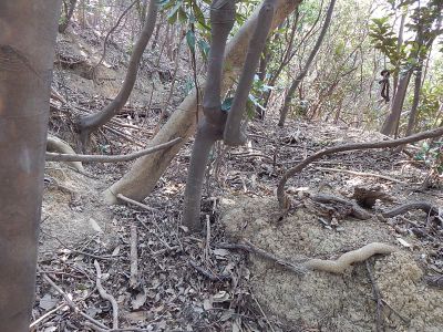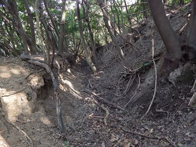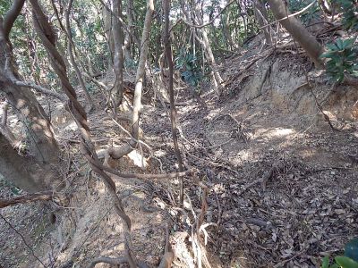 砲座と麓を繋ぐ軍道は九十九折れになっている。その内の砲座手前の区間のみ、掘り込まれている。