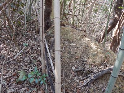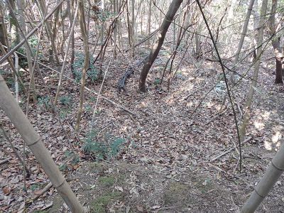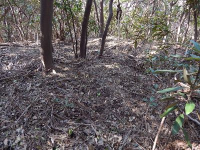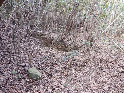 砲座のある斜面から尾根の東にある谷地eには、幾つかの施設跡っぽいものがある。ただ、何があったかまではわからない。