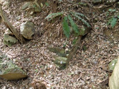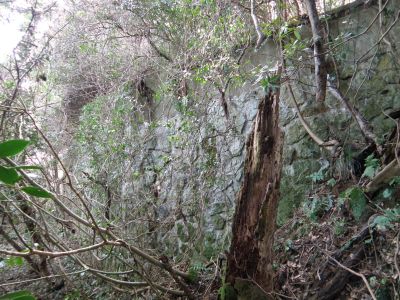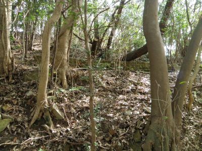 北東側の壕Iはかなり立派である。東側は石垣になり、傾斜もほぼ直角である。石垣に変わった辺りから先、藪が酷くて進まなかったが、レンガ製トーチカが北東隅にもあったようだ。