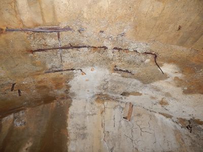 左:砲座Bを北から、右:横から、鉄筋盗りで天井アーチ部が矢印の範囲削られている