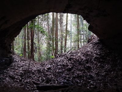 左:南西奥面、出入口の奥はすぐに岩盤、右:内部から外を
