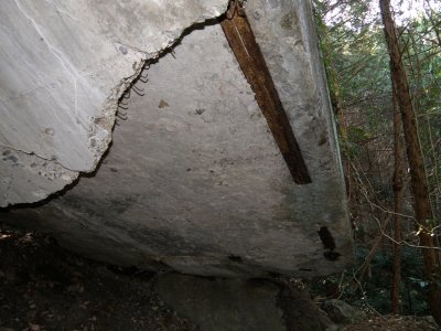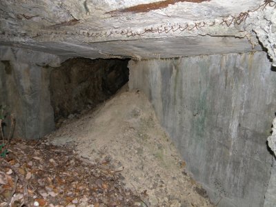 その一方で鉄屑回収業者による破壊痕も見受けられる。天井の奥部分が崩れている部分(素掘りの壕へはここから入る)は他の遺構に見られるようなタガネとハンマーによる破壊の痕跡であり、一部鉄骨が抜かれている。恐らくはあまり作業が進まない内に状況が変化し、鉄屑回収作業が中止になったようである。