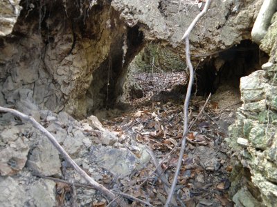 左:尾根から谷へ降りる途中の壕、右:同左内部
