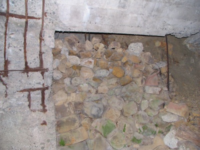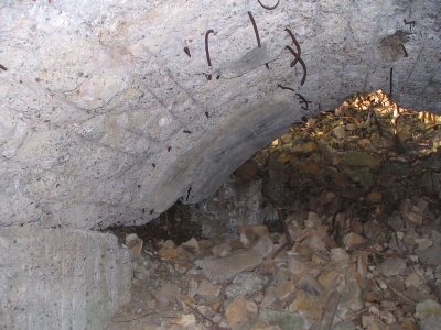 甲砲台の中では一番良く残っているものの、内部は1番砲座と同様に鉄筋を剥いだ跡が生々しい。天井には通気口の他に2ヶ所のフックが残っているが、備砲をする際のものかどうかは不明である。また奥の右隅に通路が開いているように見えるが、崩落が激しい為に通路が通じていたかどうかは不明である。