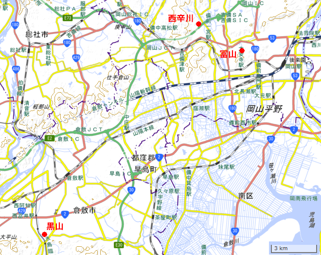 当初、冬季遠征は、Kさんから美作周辺を要望されていたのだが、今年は雪が多いということで断念。代替案として、岡山から福山にかけて、これまでに取りこぼしていた城を拾っていくこととして、集合は岡山、解散は福山の2泊3日という旅の概要が固まった。