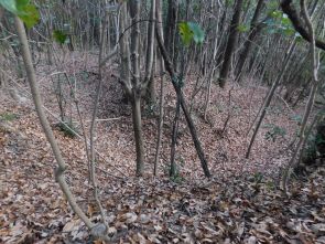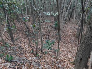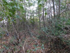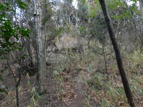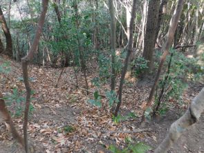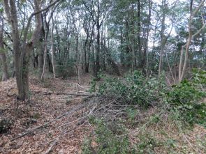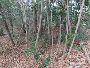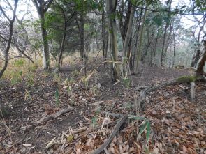 左:主郭の東下の郭の土塁?、右:更にその東下の郭