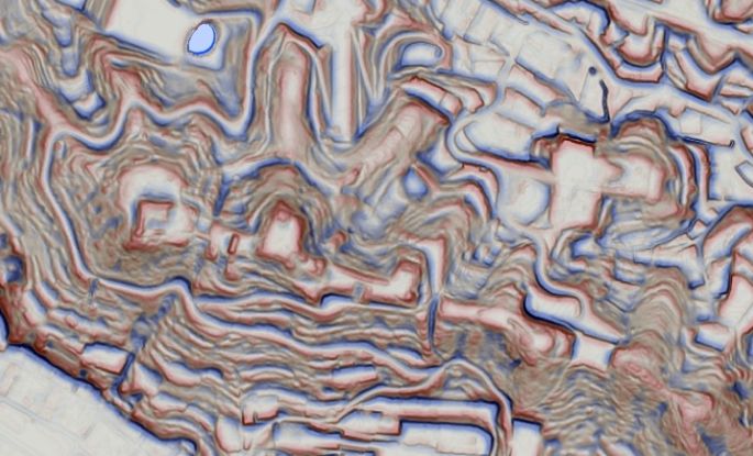 左:南中央の竪堀、右:同左は上で曲がって横堀に