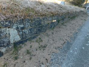 左:主郭の縁の石垣、右:主郭南下の大堀切(右が主郭側)