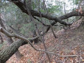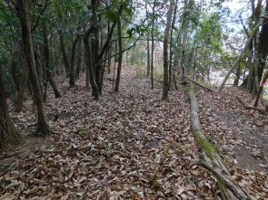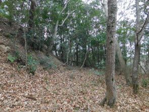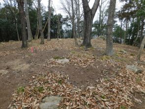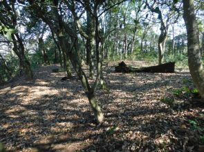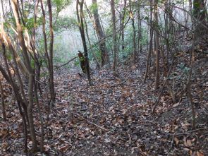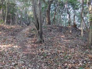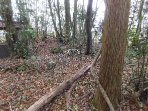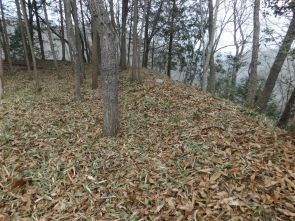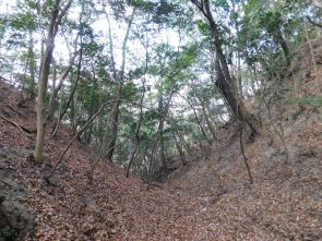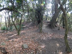 南西から登り口が出ているのだが、登った先が熊笹で覆われており、遠藤周作の碑の所までしかたどり着けなかった。そこで一度下りてから東の谷筋の道から入り、主郭下の横堀まで直登、主郭北側からどうにか主郭まで辿り着いた。ただ結果論から言うなら、遠藤周作の碑から熊笹をかき分けて帯郭を東へと回り込めば、何とかなっていた。