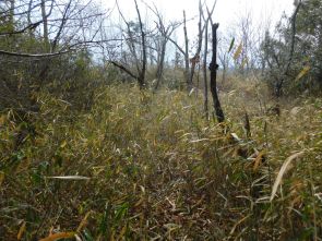 左:主郭の南西下、熊笹の海、右:東下の堀切