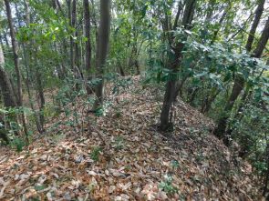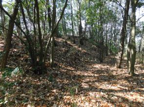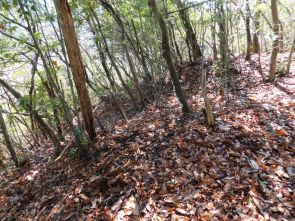 年に数回、山頂の神社で神事があるせいか、道がそれなりに整備されている。ここも畝状竪堀を突っ切る形で道が作られていた。ここ数年で1番雰囲気の良い城だった。