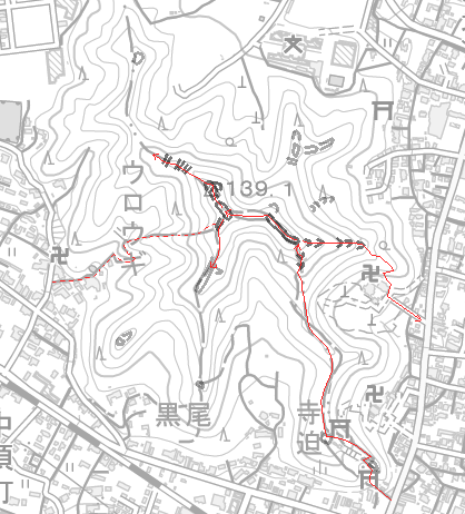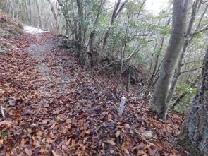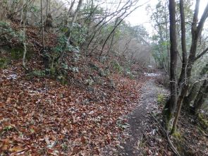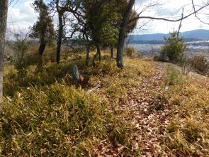 昔は縦横無尽に縦走路が整備されていたのだが、現在はほとんど機能していない。登り口がわからなくて南東麓の新市神社側から登ったが、道が倒木等で埋もれて鉈鎌が無いと進むのが難しい状態。山頂に着いてみると、南西麓の西法寺側へと降りる立派な遊歩道が出ていたので、そちらから登るのが正解。我々は車の都合があったので下りたが、安養寺の裏手からでも登れそうである。