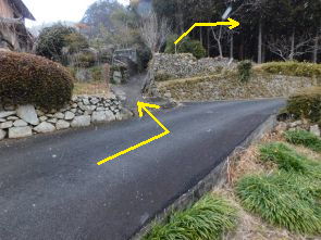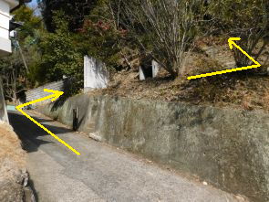 左:帯郭の畝状縦堀、右:登り口(車道をそのまま進むと安全寺)