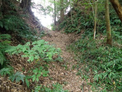 高知駅のある辺りから北へと伸びる県道16号線の脇に秦泉寺城がある。落石止めフェンスの切れ間から登る事が出来る。凹凸がはっきりと残っており、夏に登るには勿体無い城であった。